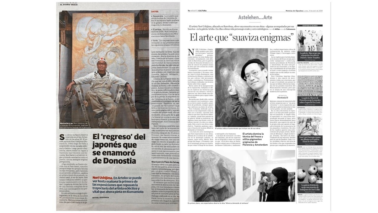 牛島徳正(昭和31年生まれ)芸名Nori Ushijimaは、熊本市の真和高校卒業後、イタリア・ウンブリア州のペルージャ国立美術大学に入学し、卒業後にイタリア・ローマの文化環境庁に所属するローマ国立中央修復研究所(Instituto Superiore per la Conservazione ed il Restauro)にただ一人の日本人初・外国人として合格入学し博士号を取得しました。その後スペインに渡り教会やホテルの数多くのフレスコ画を描きました。ヨーロッパで数多くの展覧会を開きました。彼のコレクションはスペインマルク銀行、バスク地方のクッチャ財団法人、ゴヤ美術館、ラレス城素描美術館、べネドルミーネス城美術館、カッセレス美術館などが所蔵しています。彼は年老いた両親の面倒を見るために数年前に郷里熊本に帰って来ていました。そこで高校の同級生有志がNori Ushijimaの事を熊本、日本の方々に多く知ってもらいたいと展覧会を企画しました。実行委員会は同級生の会社「有限会社富士ギフト」内に設置しました。