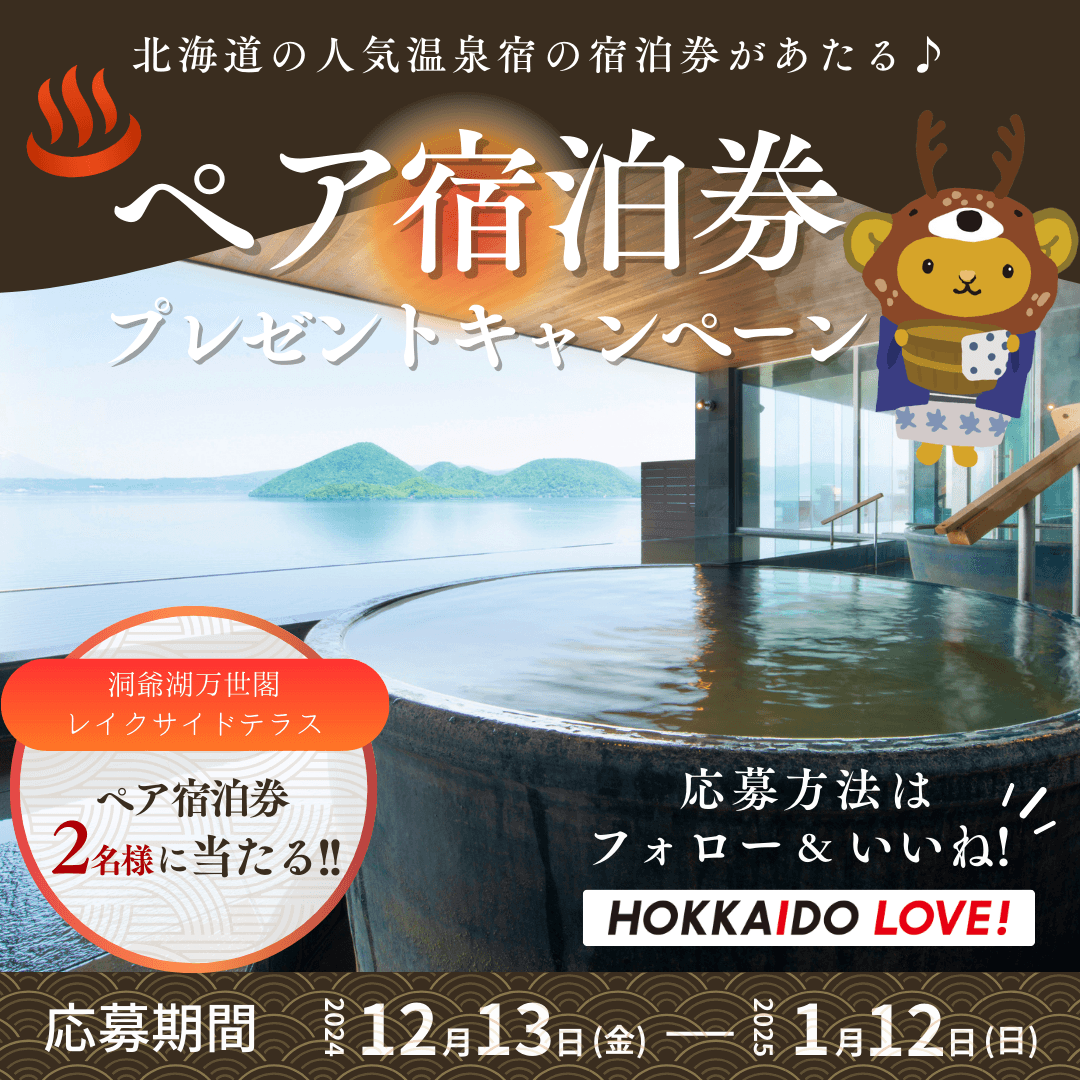 公益社団法人 北海道観光機構は、北海道の観光情報などを投稿している「HOKKAIDO LOVE!公式X」にて、温泉宿ペア宿泊券が当たるキャンペーンを2024年12月13日(金)~2025年1月12日(日)に実施しております。