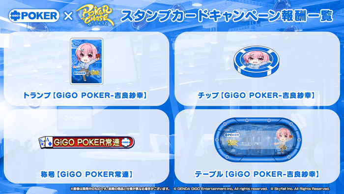 GiGO POKER新宿のお会計金額3,000円毎にスタンプを1つ押印し、スタンプの個数に応じて、「ポーカーチェイス」のゲーム内アイテム等が貰えるキャンペーンを実施いたします。