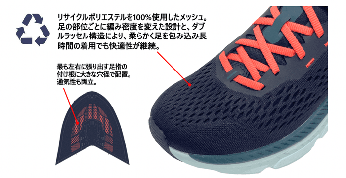 4、リサイクルポリエステル100%のエンジニアードメッシュを採用