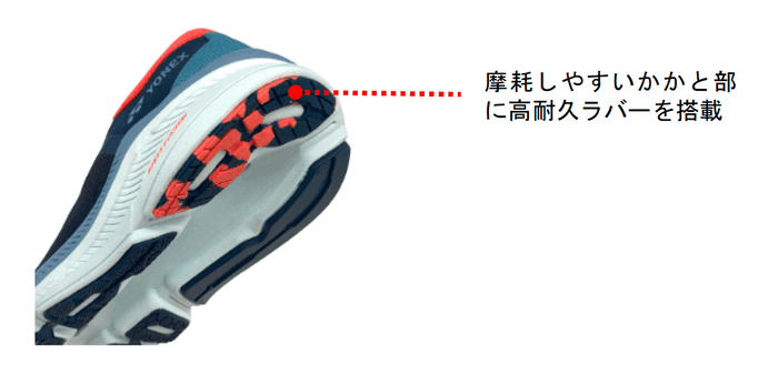 ヨネックスのテニスシューズに長年使用されている「エンデュランスラバー」を摩耗しやすいかかと部に搭載。従来品よりも約14%厚くして耐久性がさらにアップ。