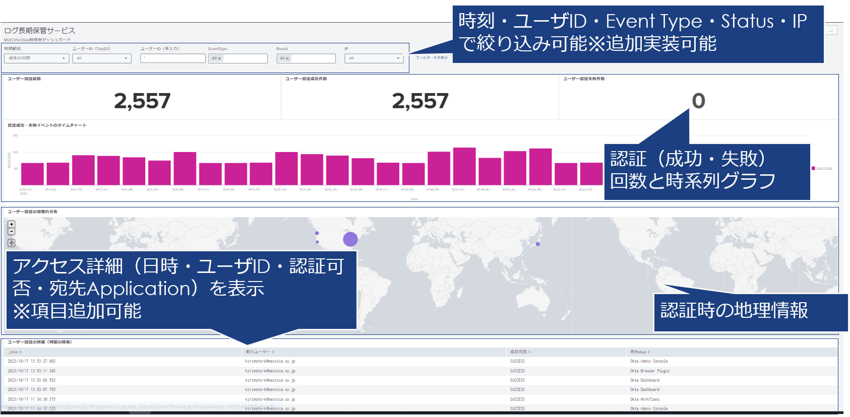 この度リリースするMUCV for Oktaは、Okta WICユーザー企業向けに開発されたデータ分析基盤で、ログの長期保存や可視化を実現します。ログを長期保存することで分析・調査の幅を広げ、またスピーディに可視化することでセキュリティ体制強化に寄与します。