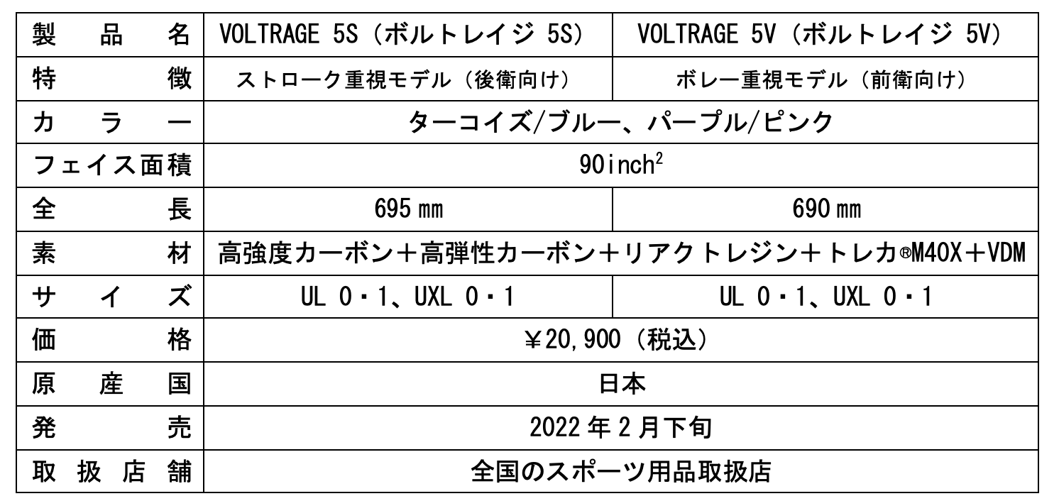 ヨネックス株式会社(代表取締役社長:林田草樹)は、“ヨネックス史上最速のスピードボール”と“大きく爽快な打球音”をコンセプトとした「VOLTRAGE」シリーズから、“シリーズ最大の飛び”と“心地よい打球感”を実現する中級者向けソフトテニスラケット「VOLTRAGE 5S/5V」、優れたホールド感と高い打球音を追求したストリング「CYBER NATURAL GALE」を2022年2月下旬より発売いたします。
