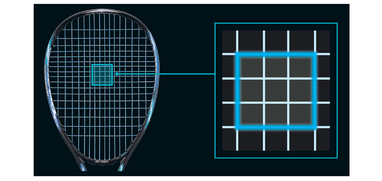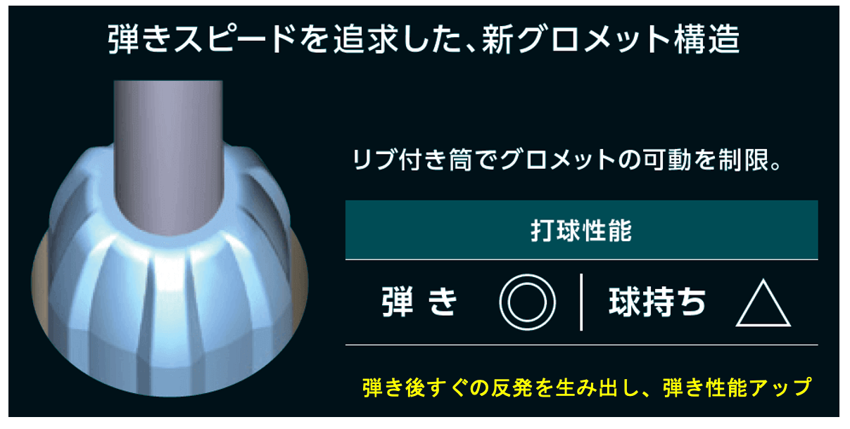 縦ストリング部分のグロメットにはリブを付け、可動域を抑制して反発力を高める新グロメット構造「RAYBURST SYSTEM(レイバーストシステム)」(特許出願中)を搭載。これらの技術により、ボールスピードと爽快な打球音を実現しました。