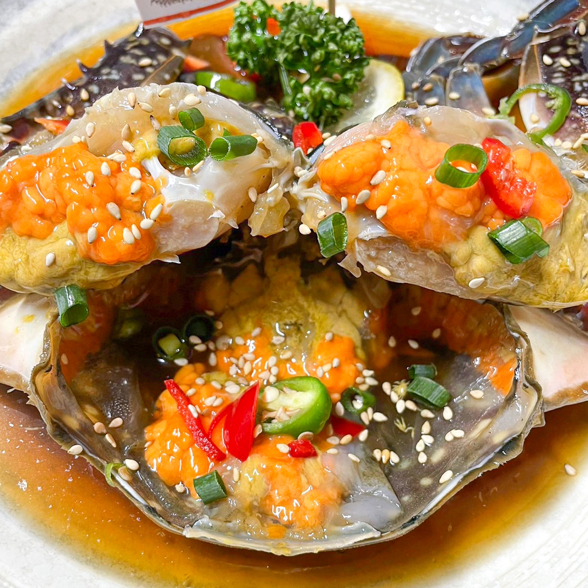 カンジャンケジャンは醤油ベースのタレに渡り蟹を漬ける韓国海鮮料理です。オープンから変わらない秘伝のタレで提供しています。長年愛された味付けです。
