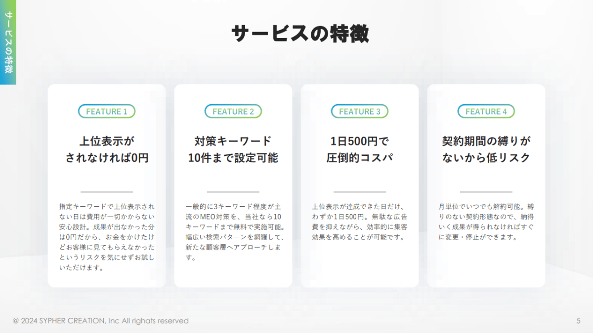 株式会社SYPHER CREATION(本社:大阪府大阪市北区梅田、代表取締役:山崎 和馬、以下:当社)は、MEO対策サービスといたしまして、契約縛りなし・初期費用0円・月額固定費0円の集客モニタープランをこのたび2025年4月1日から、全国対応にて正式リリースいたしました。