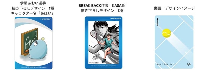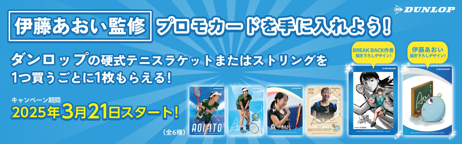 キャンペーン期間中に対象のダンロップ硬式テニスラケット、もしくはダンロップ硬式テニスストリングをご購入いただいた方にプロモーションカードをランダムで1枚プレゼントします。プロモーションカードのデザインは、全部で6種類となっており、キャンペーン特別デザインとして、「月刊少年チャンピオン」(秋田書店)で連載中のBREAK BACK(ブレークバック)作者KASA氏による描き下ろしデザイン1種、伊藤あおい選手描き下ろしキャラクターデザイン1種、その他伊藤あおい選手写真デザインが4種です。このキャンペーンでしか手に入らない貴重なカードです。ぜひこの機会にダンロップ製品をお買い求めください。