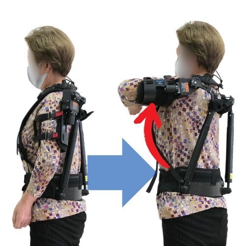 脳卒中の後遺症等で発生する上肢機能障害のリハビリテーションに活用できるアシストスーツ。ガススプリングの力で上腕部にトルクをかけることで腕を上げる力をアシストします。このアシストにより、課題指向型アプローチや機能的電気刺激を用いたトレーニングの難易度を適切に調整し、より効果的なトレーニングを実施することが期待できます。