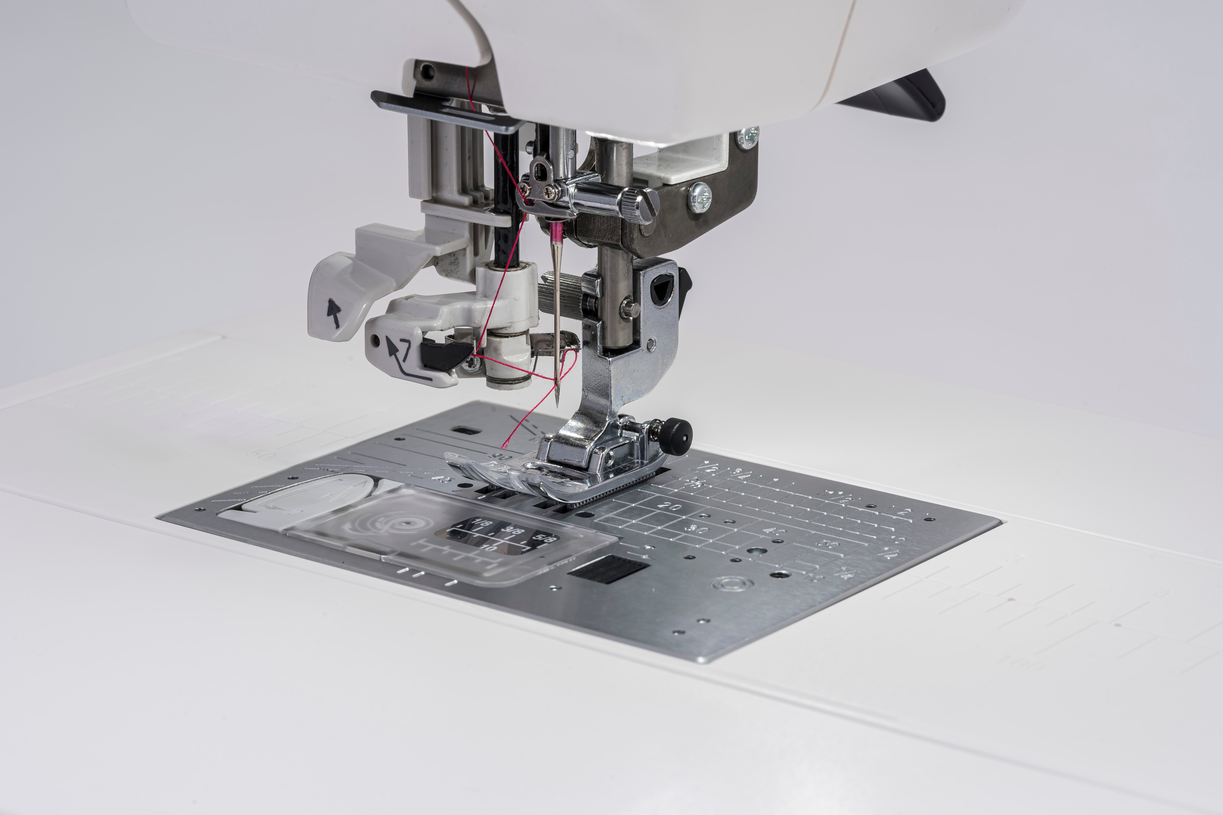 400種類の内蔵ステッチを備えており、最大振幅9mmのダイナミックなステッチを縫うことができます。標準付属の直線縫い用針板を使用することで針が布に刺さるときのバタつきが少なくなり、より美しい縫製を実現します。針板は用途に合わせて3種類。ワンタッチでスピーディーに交換できます。