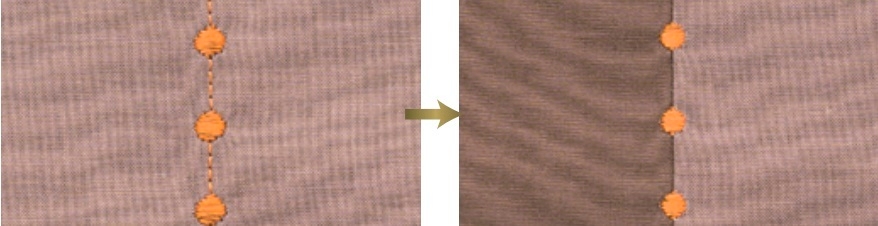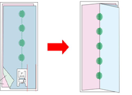 ミラージュステッチは重ねた布に縫ってから布を開くと、つなぎの直線縫いは隠れて見えなくなり、サテンステッチのみが布地の表面に現れます。「ミラージュ」とは蜃気楼のことで、ステッチが魔法のように現れるイメージから名付けられました。