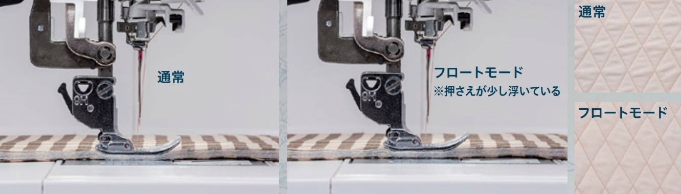 押さえが針板面からわずかに浮いた状態で縫うことができるため、キルト芯を挟んでのステッチがけや、布ズレ、布のシワを軽減し、より満足度の高い仕上がりに。小回りが利くので細かい箇所を縫うときの作業性も向上します。