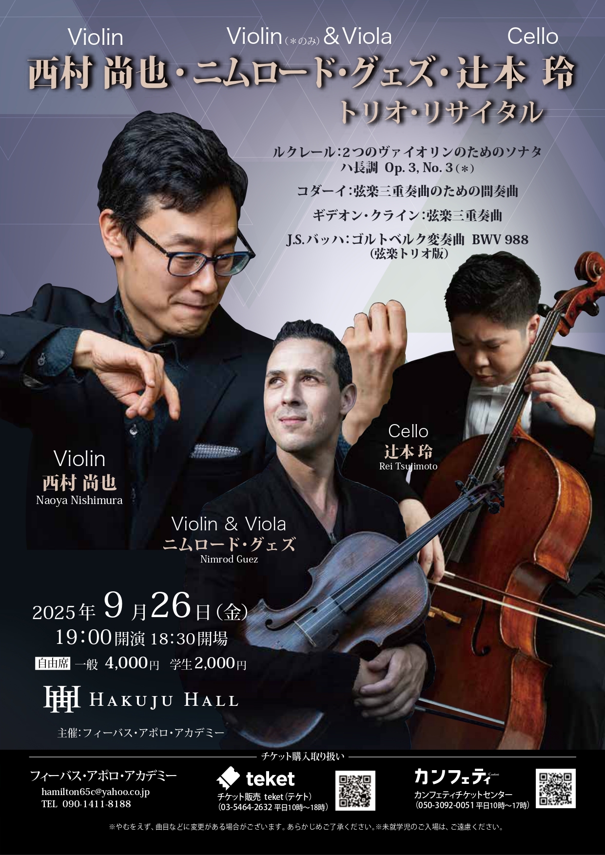 フィーバス・アポロ・アカデミー主催、『西村 尚也 ニムロード・グェズ 辻本 玲 トリオ・リサイタル』が2025年9月26日 (金)にHakuju Hall(東京都渋谷区富ヶ谷1-37-5)にて上演されます。