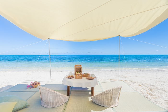星のや竹富島に隣接するアイヤル浜に畳の特等席を設えます。どこか懐かしく感じられるような、落ち着く設えです。背もたれのある座椅子のおかげで、手足を伸ばして寛ぐことができます。のんびりと過ごすことができるよう、大きな日除けも設置します。ピクニックボックスをテーブルに広げ、輝く海を眺めて春の南風を感じながら、ゆったりと過ごせる空間です。