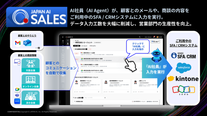 JAPAN AI SALESは、営業現場における日々の活動記録を自動的に顧客管理システムへ入力する営業部門向けのAIエージェントです。商談やメールのやり取りを分析し、必要な情報を適切な形式でGENIEE SFA/CRMやSalesforceなどの顧客管理システムに反映します。