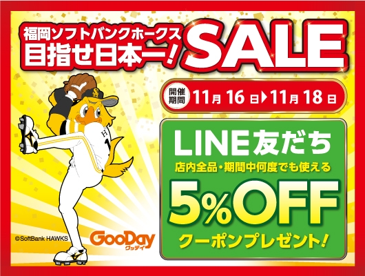 北部九州・山口にてホームセンターグッデイを運営している株式会社グッデイ(本社:福岡市博多区 代表:柳瀬隆志)は、福岡ソフトバンクホークスのクライマックスシリーズ突破を記念して、「福岡ソフトバンクホークス目指せ日本一!SALE」を、明日11月16日(月)~18日(水)までの3日間、グッデイ全65店舗(PayPayモール店除く)にて開催いたします。