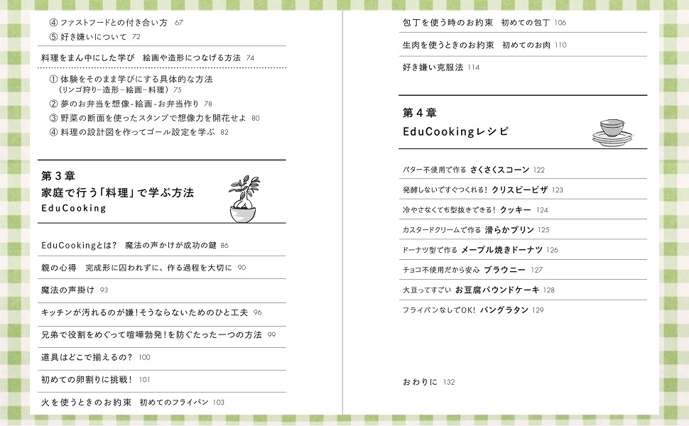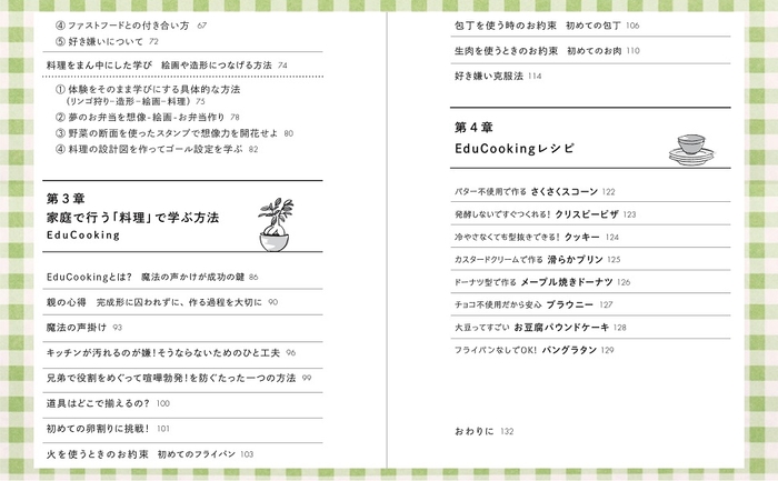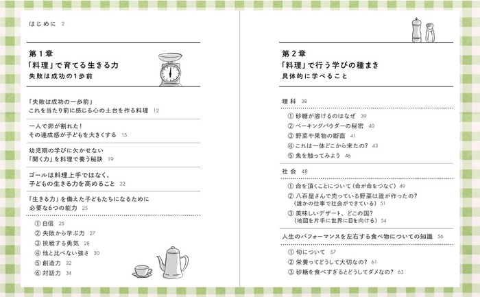 料理は、自制心や目標を立てて行動すること、協調性など、子どもの非認知能力を育てる絶好の教材と語る著者。レシピも収録されているので、ご家庭でも、学びの幅を広げる子供向け料理が実践できます。