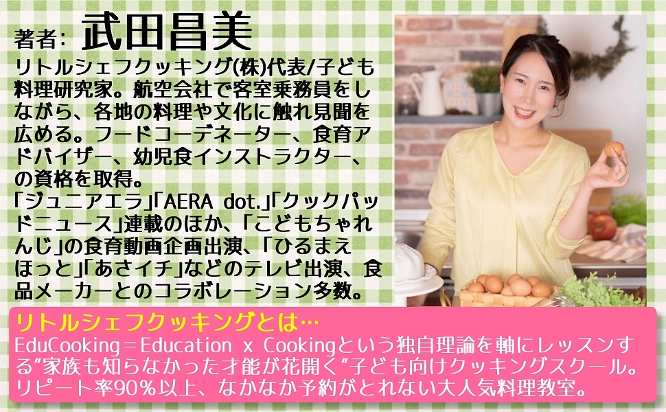 料理を通して、これからの人生に備える心を育めると人気の料理教室-リトルシェフクッキングのメソッドが本になりました。著者の武田昌美さんは、フランス料理のシェフだった父の影響で幼いころから料理に親しんできました。母親になって、自身が子育てに料理を取り入れたところ、子どもの能力や可能性を広げることができると思い、幼児教育型の料理教室を設立。これまで5年で4000人以上の子どもたちに、料理を通じて①自信②失敗から学ぶ力③挑戦する勇気④他と比べない強さ⑤創造力⑥対話力 の6つの能力を伝えてきました。子どもたちが料理をすることで変わっていくのを目の当たりにし、より多くの人にその指導法やレシピを伝えたいと書籍化に至りました。
