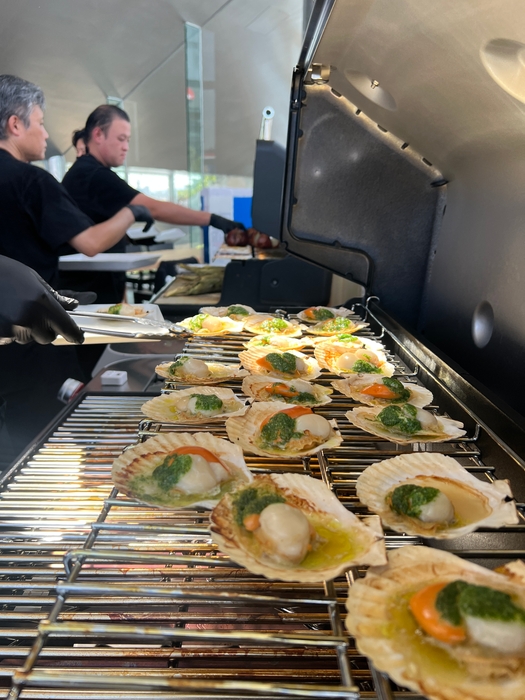 店舗スタッフは調理やオペレーションの確認を行い、来場者は大きなBBQグリルで焼き上げられる海鮮や野菜、三田ポークの塊肉をスマートフォンで熱心に撮影するなど、和やかな雰囲気の中で料理を味わいました。