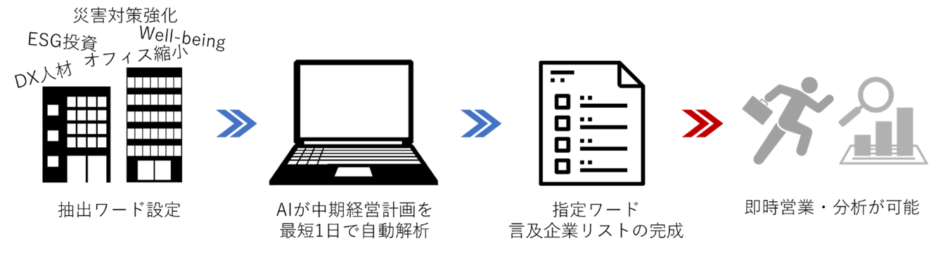 ターゲットとしたいワードを設定(複数可能、上限無し)することで、中期経営計画の中で該当ワードを言及している企業リストを最短1日で作成します。企業抽出にあたっては、業種、エリア(本社拠点)で絞り込むことも可能な為、ターゲットを絞り込んだ精度の高い営業リストの作成が可能となります。
