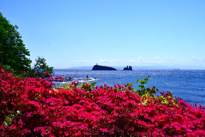 ツツジの花と脇野沢地区の鯛島を背景に撮影しました。