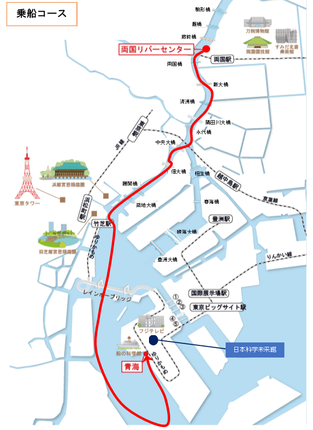 両国リバーセンター受付集合(9時)⇒水上バス乗船・両国リバーセンター発着場発(9時15分)~隅田川下る~東京港~青海コンテナふ頭付近Uターン~青海着・水上バス下船(11時15分)⇒日本科学未来館着(11時30分)