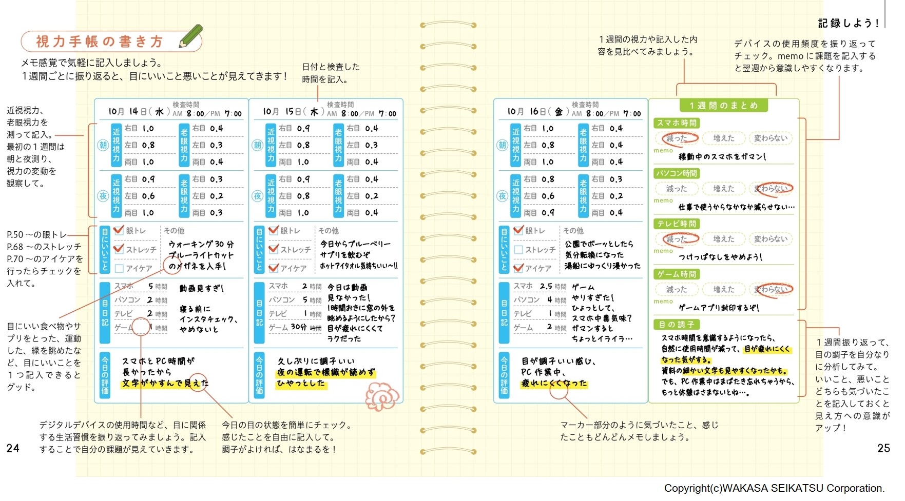 また、「視力手帳」がついているので、記録を続けていくことで視力の変化もわかります。
