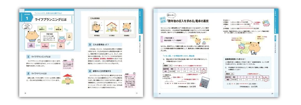 フルカラーの「マンガ1コマFPナビ」での各レッスンのイメージ付けからはじまり、図解を使ったわかりやすい解説、「語呂合わせ」で覚えやすい暗記、難しい分野をサポートする「特別講義」といった試験に必要な学習要素を飽きさせないための工夫が盛り込まれています。