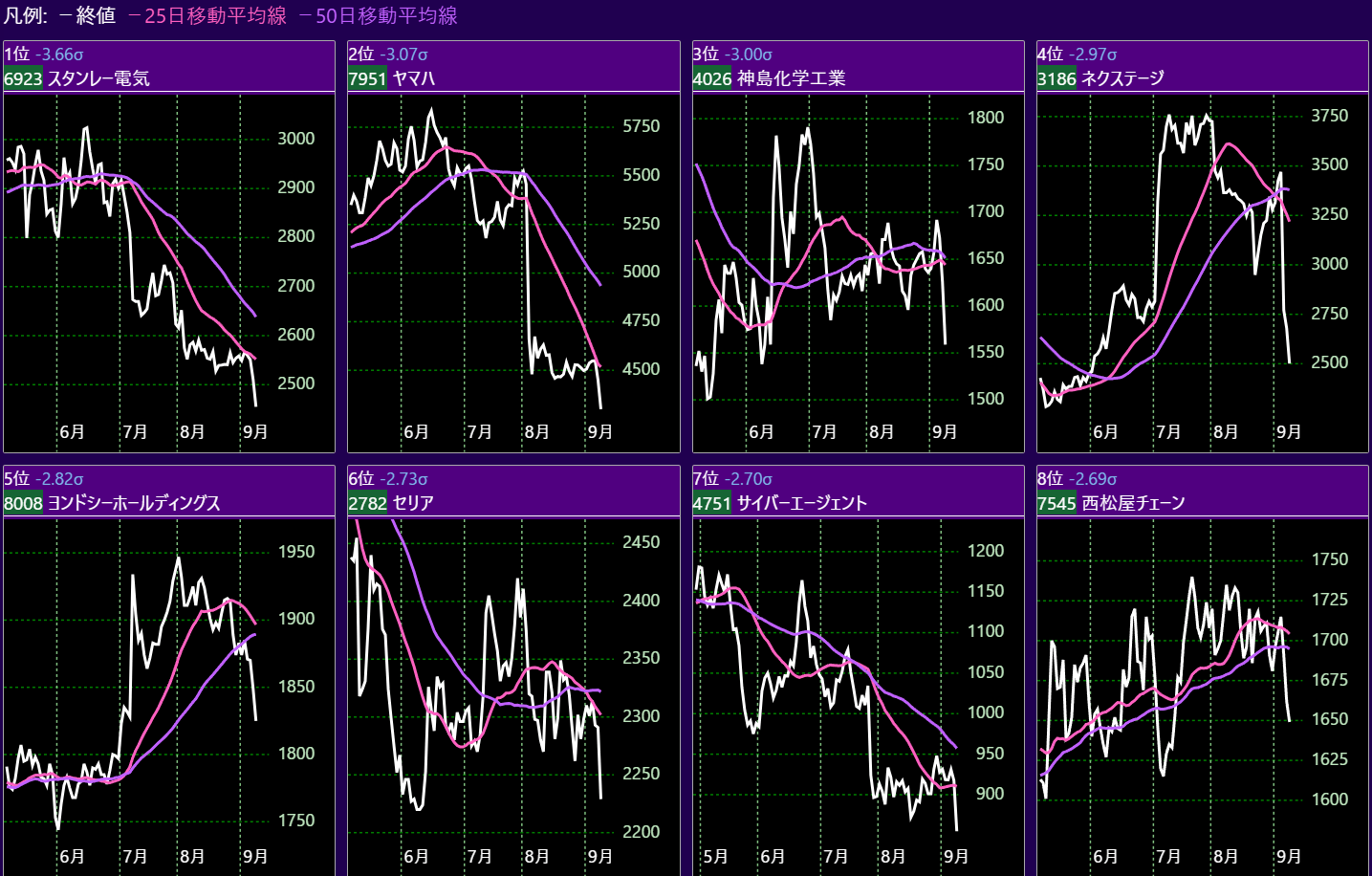 上記(1)(2)いずれの場合でも、多数の銘柄の直近3か月のチャートを1枚の画面で見ることができます。