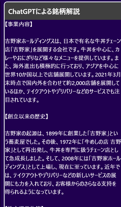各企業のおおまかな解説と業績情報をChatGPTに出力させたものをチャート画面上に表示しています。さらに、この会話の続きをTacticoユーザ自身がさらにChatGPTに質問を投げることで継続できるようにしています。