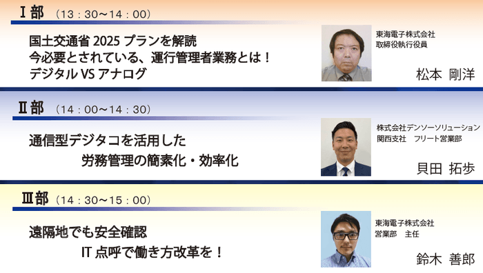 点呼機器およびアルコール検知器を開発・販売する東海電子株式会社(本社:静岡県富士市 代表:杉本 哲也)は、 この度、株式会社デンソーソリューション(本社:東京都渋谷区 代表:久米 利也)と合同無料ウェブセミナー「データー通信機器で働き方改革を」を6月29日(火)、7月7日(水)に開催いたします。