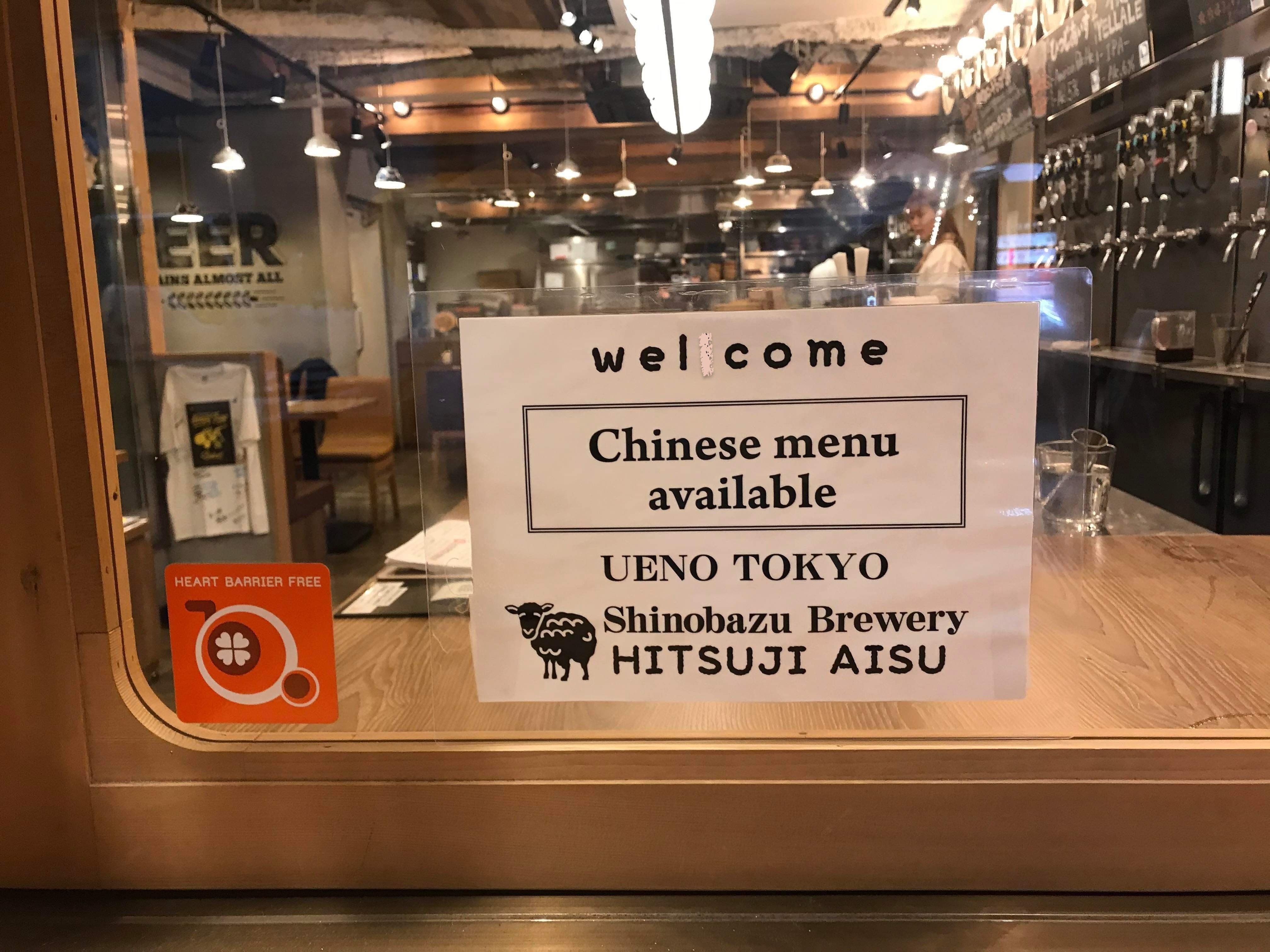 ▲「シノバズブルワリー ひつじあいす」のエントランスでは中国語メニュー表があることを表示