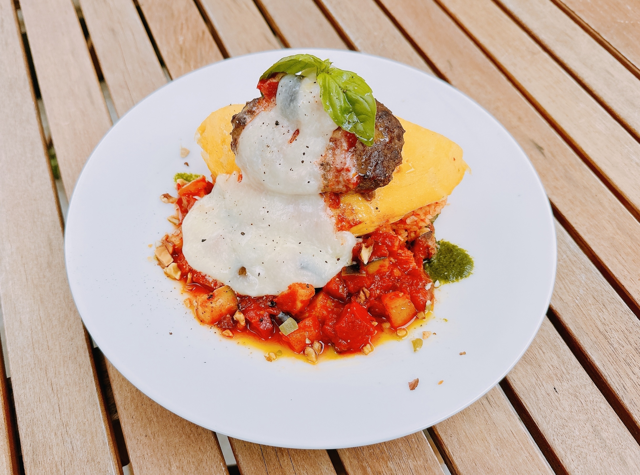 茨城県ブランド牛『常陸牛』のハンバーグと天てり卵を使用したオムレツをふんだんにトマト、ナス、ブロッコリーなどの夏野菜のラタトゥイユでお召し上がりください。暑い夏を乗り切ろう。