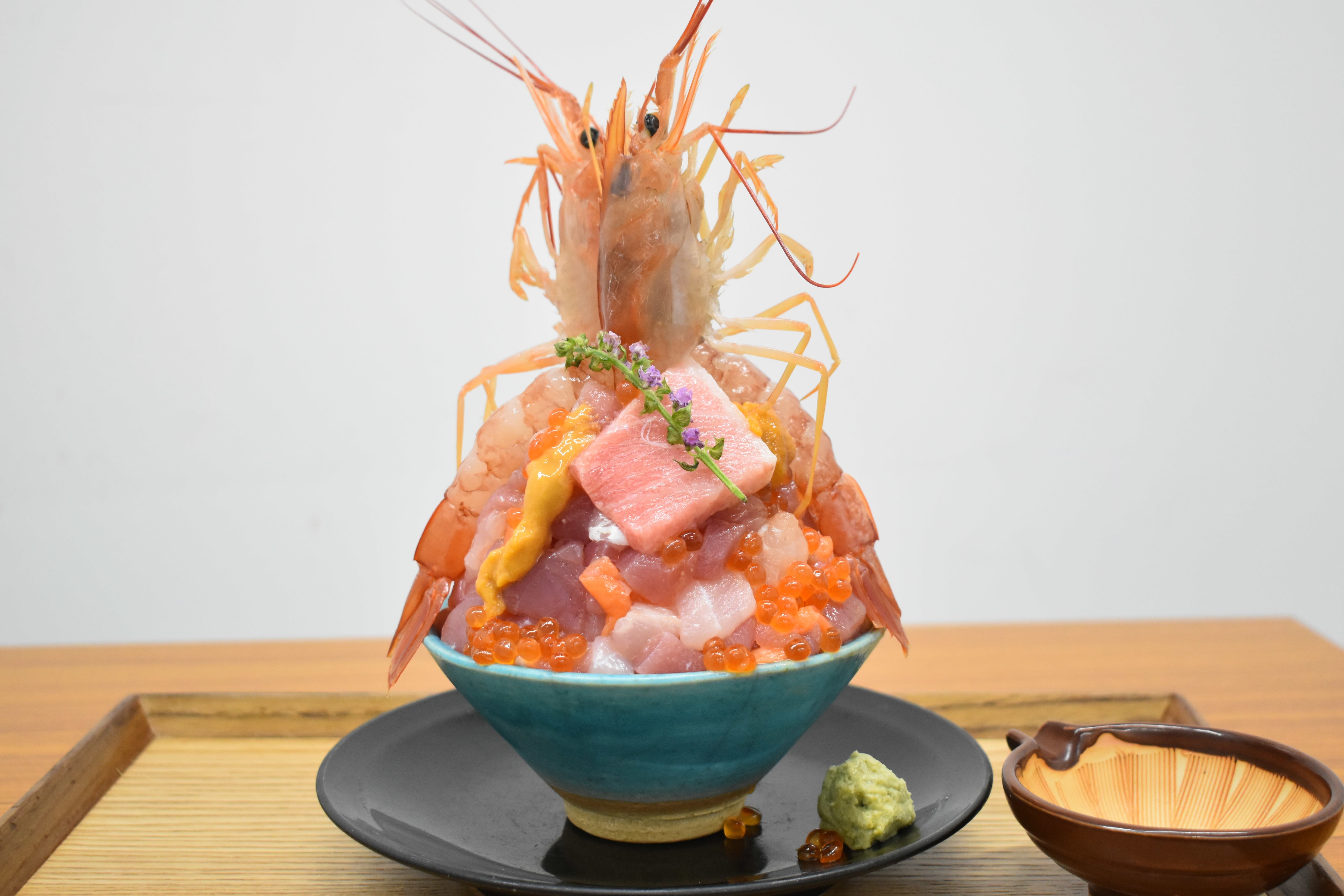 人気商品「てっぺん丼」の具材をこの夏はトロ、うに、赤海老とふんだんに乗せた絶品。そびえたつ赤海老は天守閣をイメージしています。