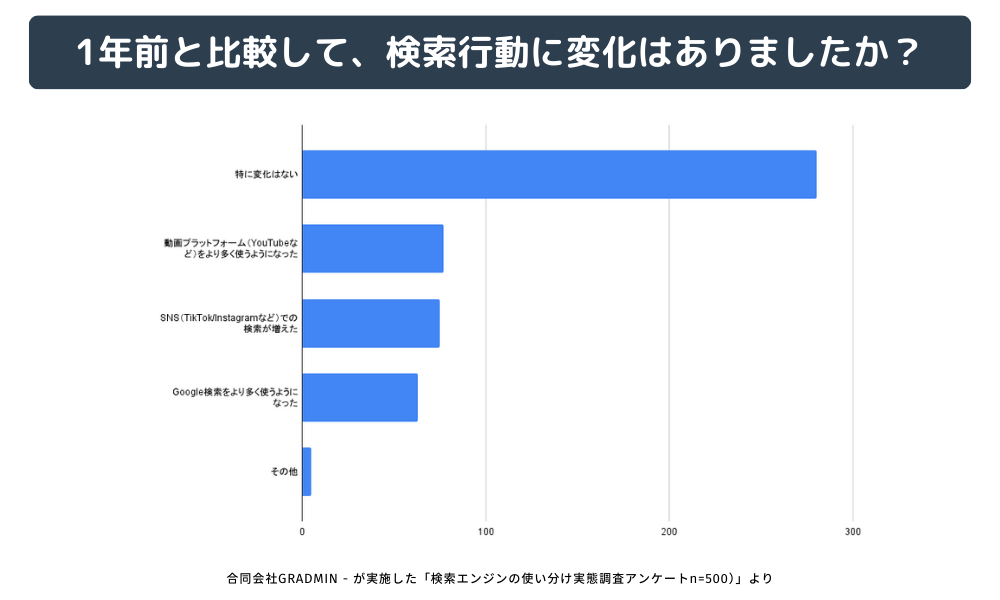 過去1年間の検索行動の変化について、56.0%が「特に変化はない」と回答。一方で、約30%は「動画プラットフォーム」や「SNSでの検索が増えた」と回答しており、徐々に検索手段の多様化が進んでいることが示唆されます。