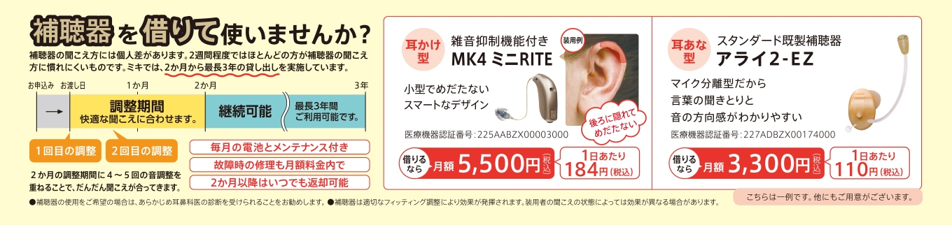 月額税込3,300円~ 定額にて補聴器を貸し出しいたします。使えるようになるか不安な方は、まずは補聴器を借りることから始めてみませんか?