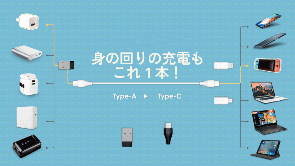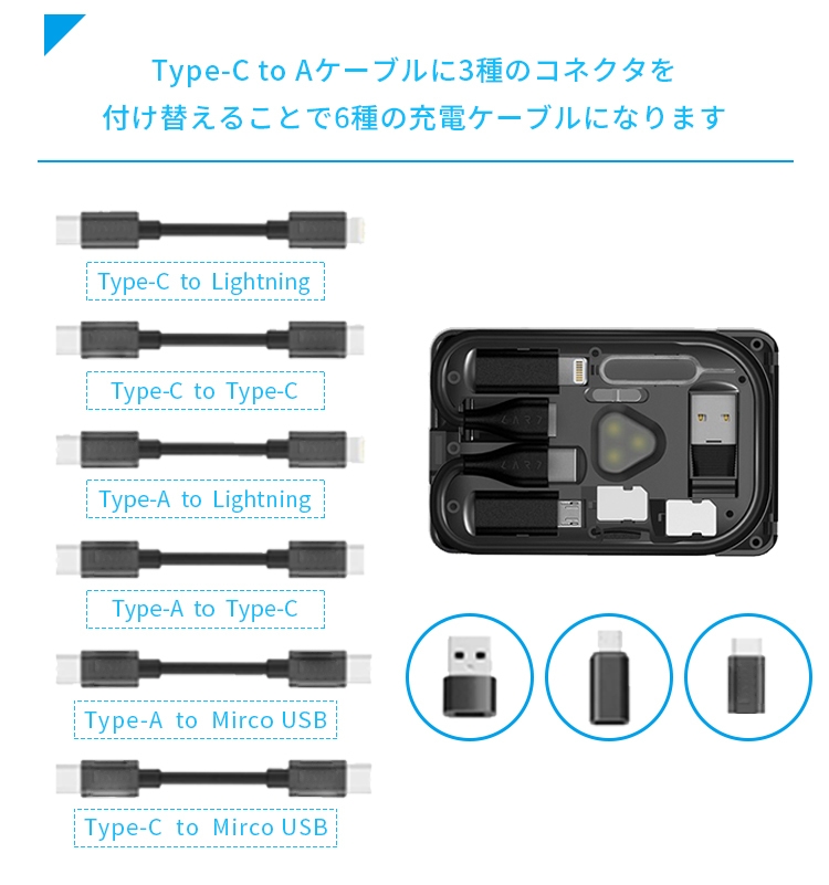 Type-CtoCケーブルに3種のコネクタを付け替えることで6種の充電ケーブルになります。