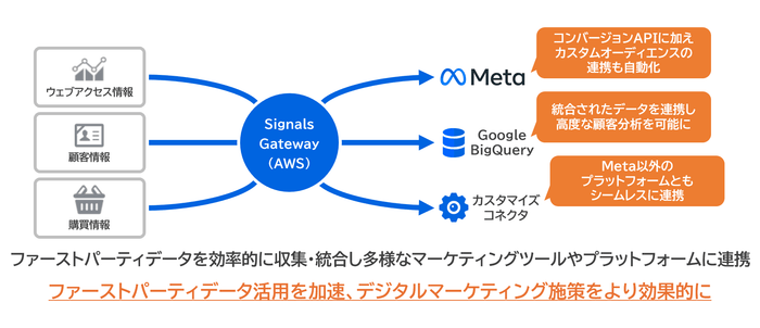 「Signals Gateway」は、Metaが提供するクラウドベースのソリューションです。企業のファーストパーティデータを効率的に収集・統合し、Meta広告をはじめ様々なマーケティングプラットフォームへ安全に連携します。これにより、企業はファーストパーティデータを有効に活用し、顧客理解を深め、マーケティング施策の精度を高めることができます。また、従来のオンラインデータの活用に加え、店舗データや顧客データベースなどのオフラインデータも活用可能となり、より包括的な顧客理解とデジタルマーケティングの高度化が実現します。
