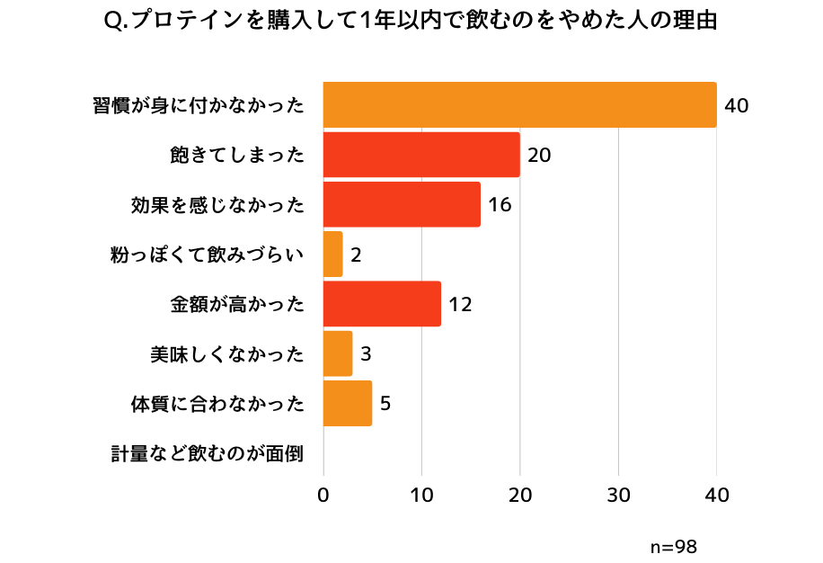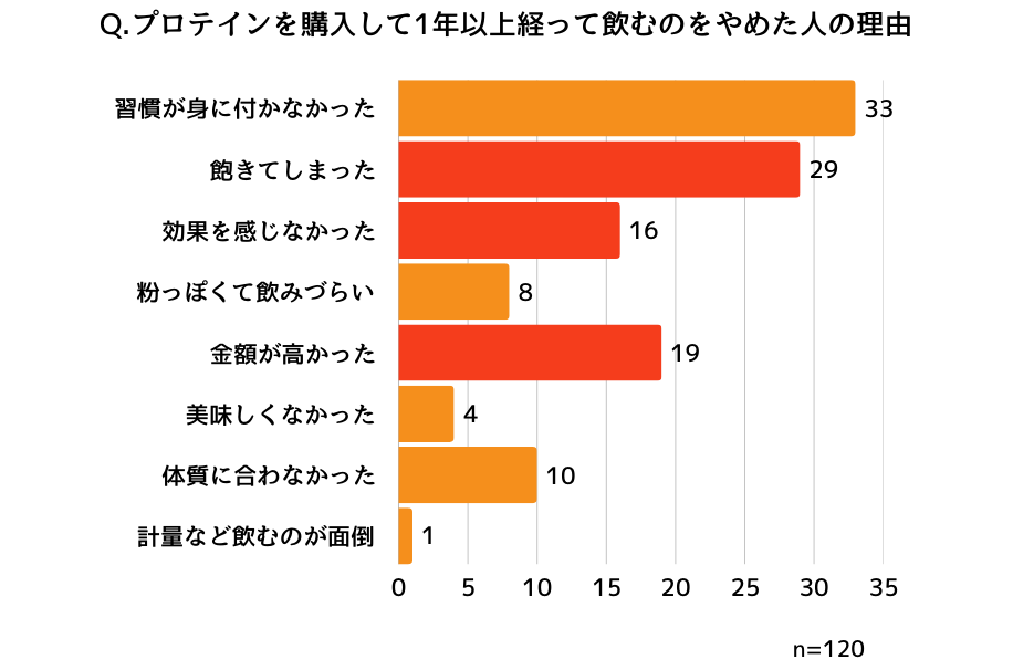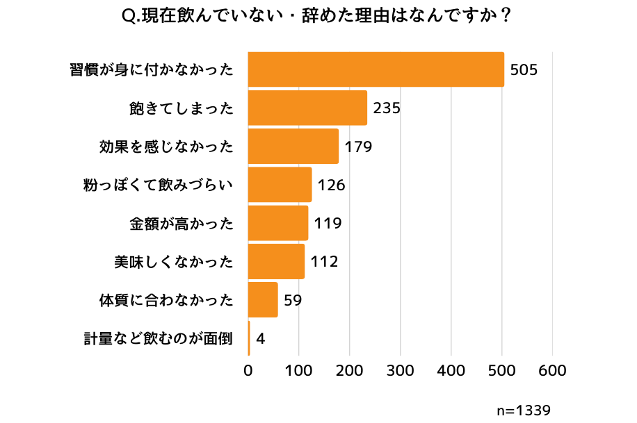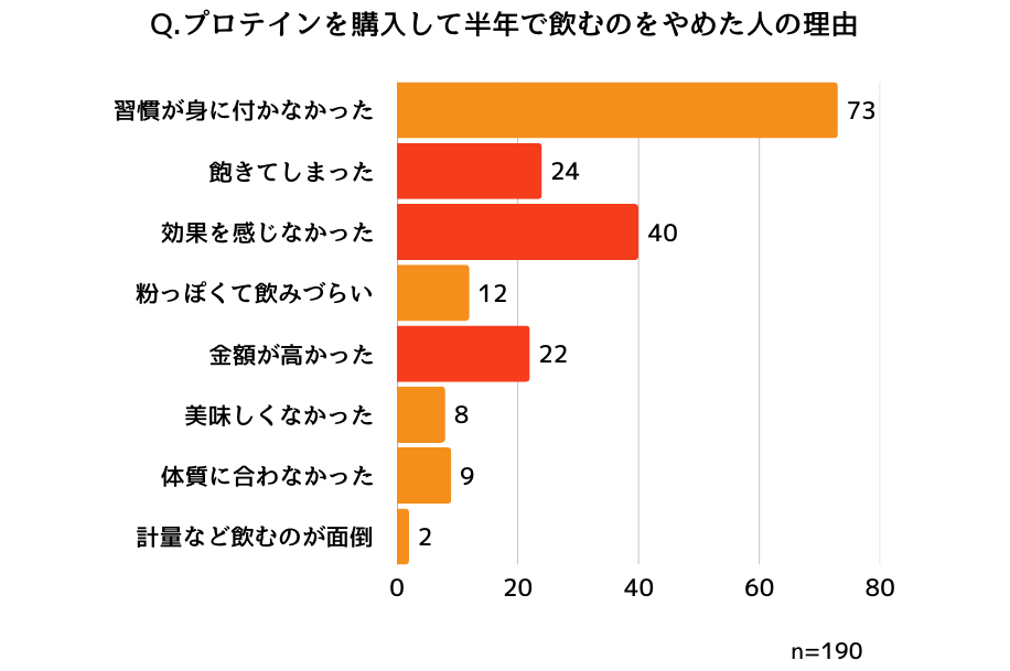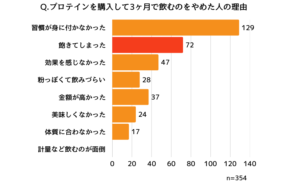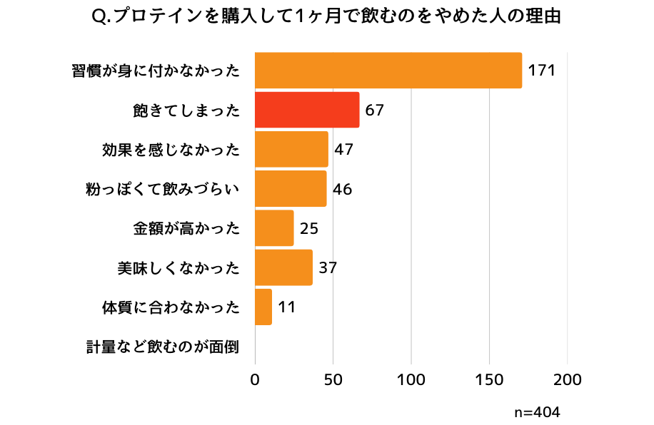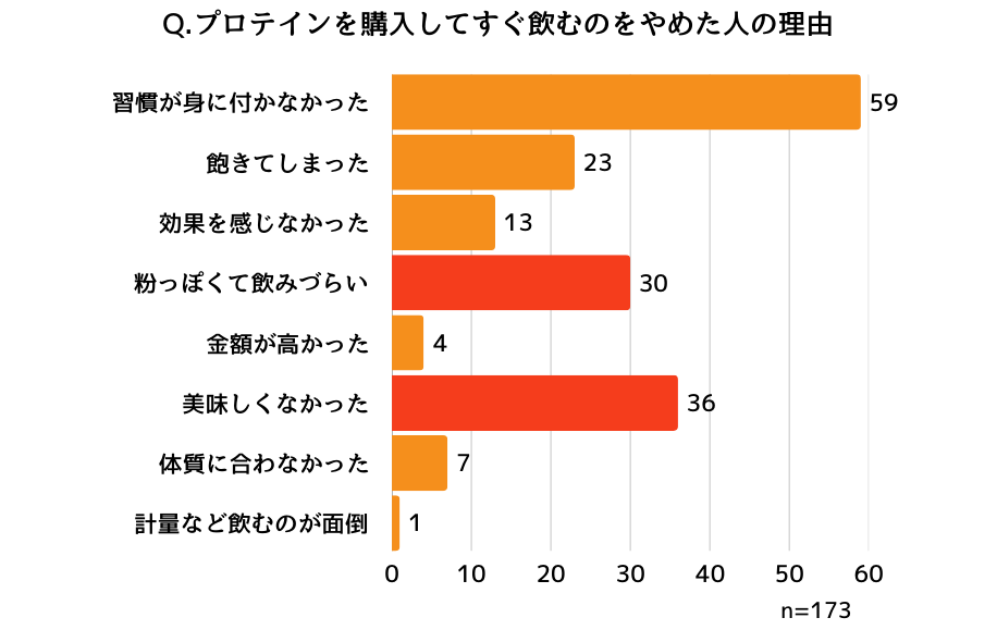 プロテイン特有の粉っぽさや味が受け入れられず、すぐに辞める方が多いことがわかりました。