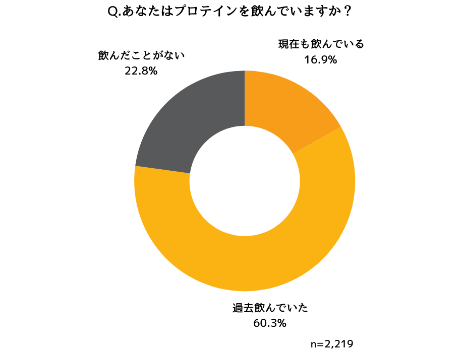 20代〜60代の女性に「プロテインを飲んでいるか」尋ねたところ、「現在も飲んでいる」と回答した方が16.9%、「過去飲んでいた」と回答した方が60.3%という結果になりました。これらを合算すると、77.2%の人が「プロテインを過去に一度は飲んだことがある」といえます。