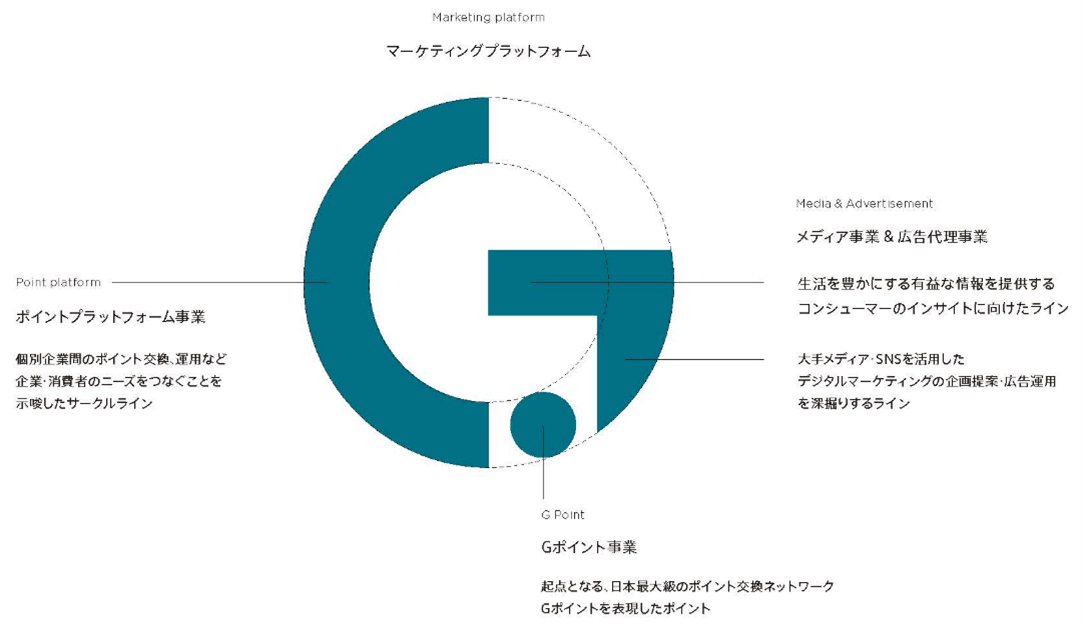 (1) コア事業であるポイントをアクセントに、現在の4つの事業をGマークのパーツで表現