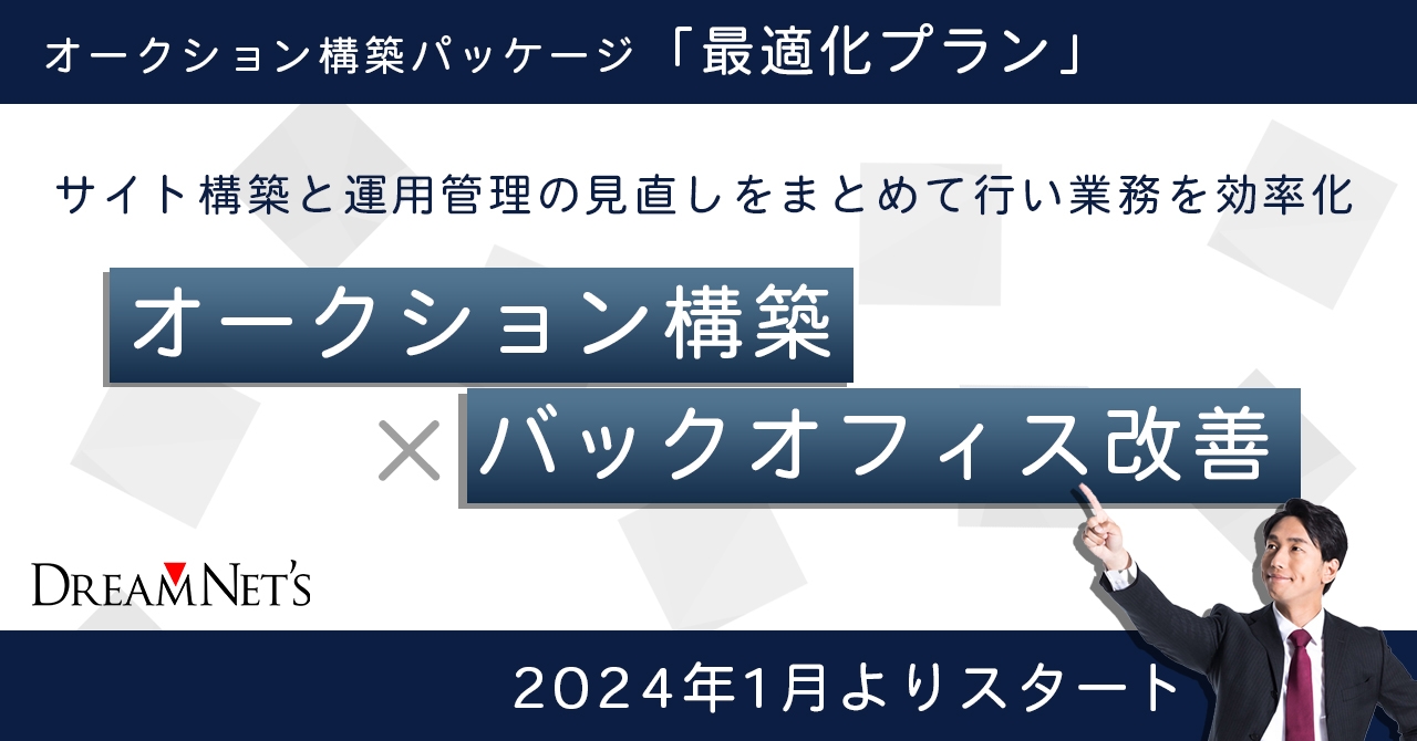 株式会社ドリームネッツ(本社:広島県福山市、代表取締役社長:井上 一成)は、自社で高機能オークションサイトを始められる「オークション構築パッケージ」において、サイトの制作だけでなくバックオフィスの見直しによる業務改善までまとめて任せられる新プラン「最適化プラン」を、2024年1月に提供開始いたします。