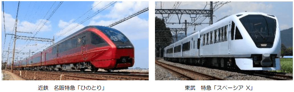 近鉄「ひのとり」は「くつろぎのアップグレード」をコンセプトに、大阪難波~近鉄名古屋間で運行している名阪特急です。東武「スペーシア X」は、「自分だけの最適な日光・鬼怒川エリア」とつながることをコンセプトとし、2023年に浅草~東武日光・鬼怒川温泉間でデビューしました。