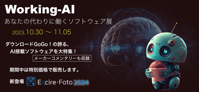 「Working-AI あなたの代わりに働くソフトウェア」展は、ダウンロードGoGo!が取り扱うソフトから6商品をピックアップし、各ソフトの中でAIが果たしている役割に注目した解説を行います。