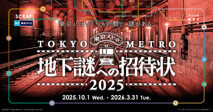 全世界で累計1,490万人以上を動員しているリアル脱出ゲームを企画制作する株式会社SCRAP(本社:東京都渋谷区、代表:加藤隆生)は、東京地下鉄株式会社(本社:東京都台東区、代表取締役社長:小坂 彰洋、以下「東京メトロ」)とともに、「ナゾトキ街歩きゲーム」の人気シリーズ「地下謎」の完全新作『地下謎への招待状 2025』を2025年10月1日(水)より開催することを発表いたします。