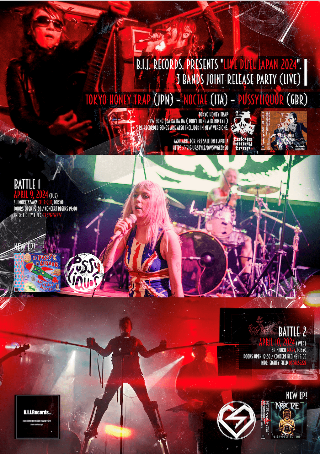 【No Risk No Future】をスローガンに第六世代のロックを標榜するB.I.J.Records.が、「新人バンドやアーティスト達を独特の選択眼で世界中から集め、日本から世界的スターを育てる事」をコンセプトに、イタリアよりNOCTAE、イギリスよりPUSSYLIQUORを招き、日本からは首謀バンドであるtokyo honey trapが出演となる三国同盟 リリースパーティーライブイベントの開催が、いよいよ2024年4月9日(火)、10日(水)に迫っていることをお知らせします。