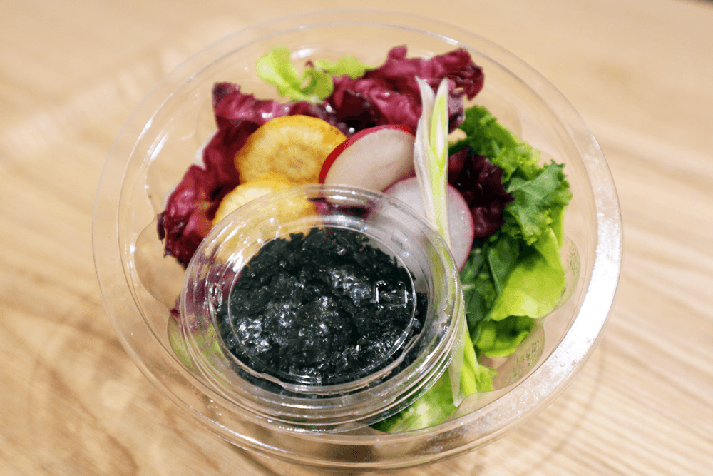 身体に嬉しい食材を選んでいます。ブーケレタスは苦味やくせが少ない味わい。ケールはビタミン・ミネラル・食物繊維など、現代人に不足しがちな栄養素を補うスーパーフードです。トレビスはカリウムを比較的多く含み色が鮮やかなのが特徴です。フルーツ人参、ラディッシュ、エシャレットで彩りを加え、当社のNB商品「のりカケルくん」をドレッシング代わりに和えて召し上がっていただく商品です。