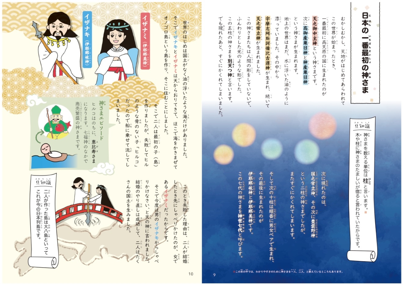 前半では、難しいイメージのある日本最古の書物『古事記』から有名なエピソードをやさしく紹介。イザナキとイザナミ、アマテラスやスサノオ、オオクニヌシ、ヤマトタケルなどの神さまたちがかわいいイラストで登場します。