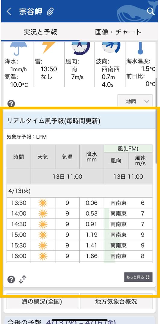 気象庁が提供する「局地モデル(以下 LFMという)」と呼ばれる数値予報モデルの情報を用いており、30分間隔の風向・風速、天気、気温、降水量の予報を提供いたします。