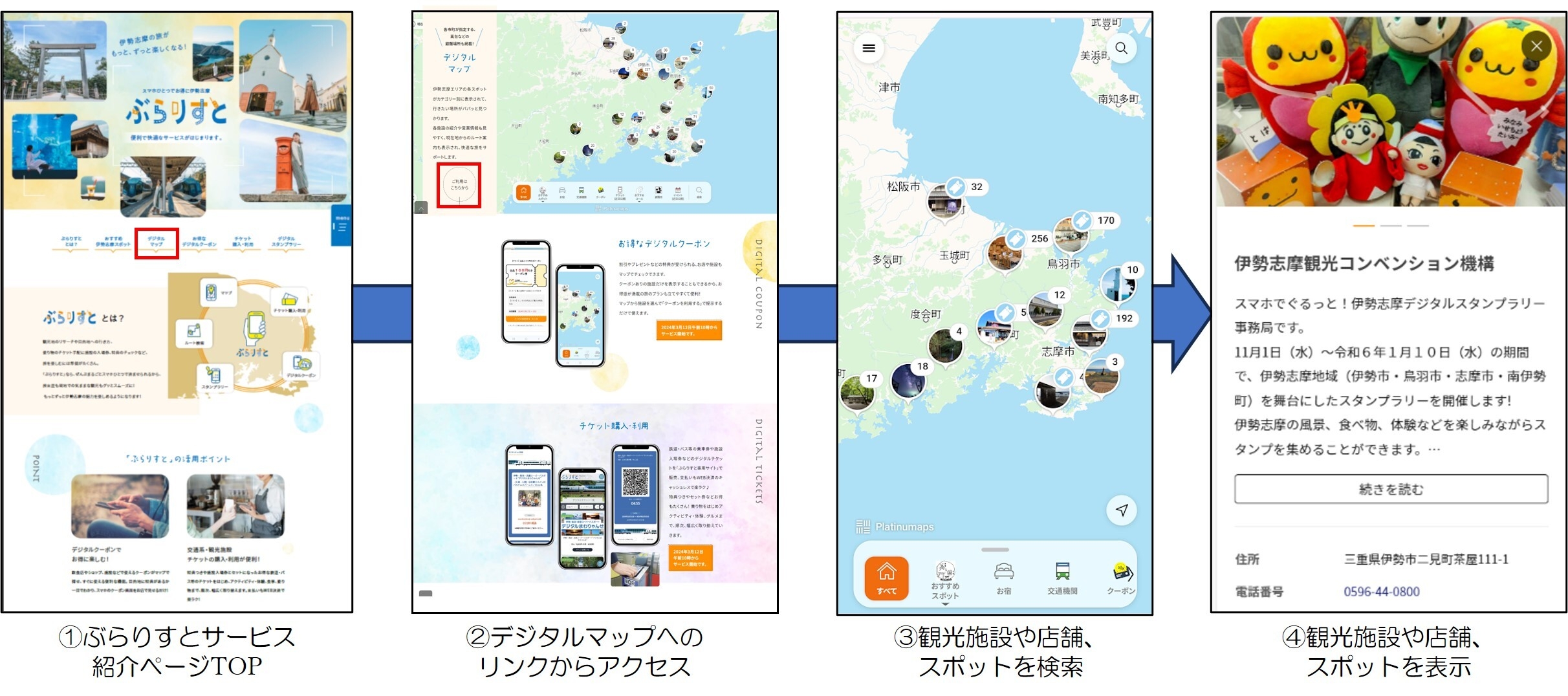 「ぶらりすと」は、伊勢志摩観光コンベンション機構の公式サイト「伊勢志摩観光ナビ」からご利用いただくことができ、デジタルマップによる観光案内のほか、デジタルクーポン、デジタルスタンプラリー、デジタルチケット機能などが一体となったサービスです。本サービスは、アプリのダウンロードを必要とせず、全てWEBページで気軽にご利用いただくことが可能で、伊勢志摩を観光するお客様の利便性を高め、地域内での周遊・滞在時間をより充実したものにしてくれます。