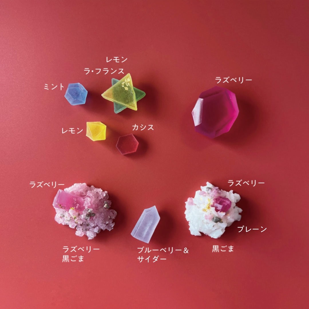 ルビーの赤い表現を引き立てるべく、青や赤などの色を使った鉱物も一緒に構成しました。見た目の美しさだけでなく、色ごとに味が違うのも特徴。味も裏切らないを目指した、ハラペコラボの琥珀糖こうぶつヲカシ。青はミント、水色はサイダー、黄色はレモン、緑はラ・フランス、濃い赤はカシス、紫はブルーベリー、黒は黒ゴマとメインのルビーに使われているラズベリーの他にも食べ応えのある構成になっている。